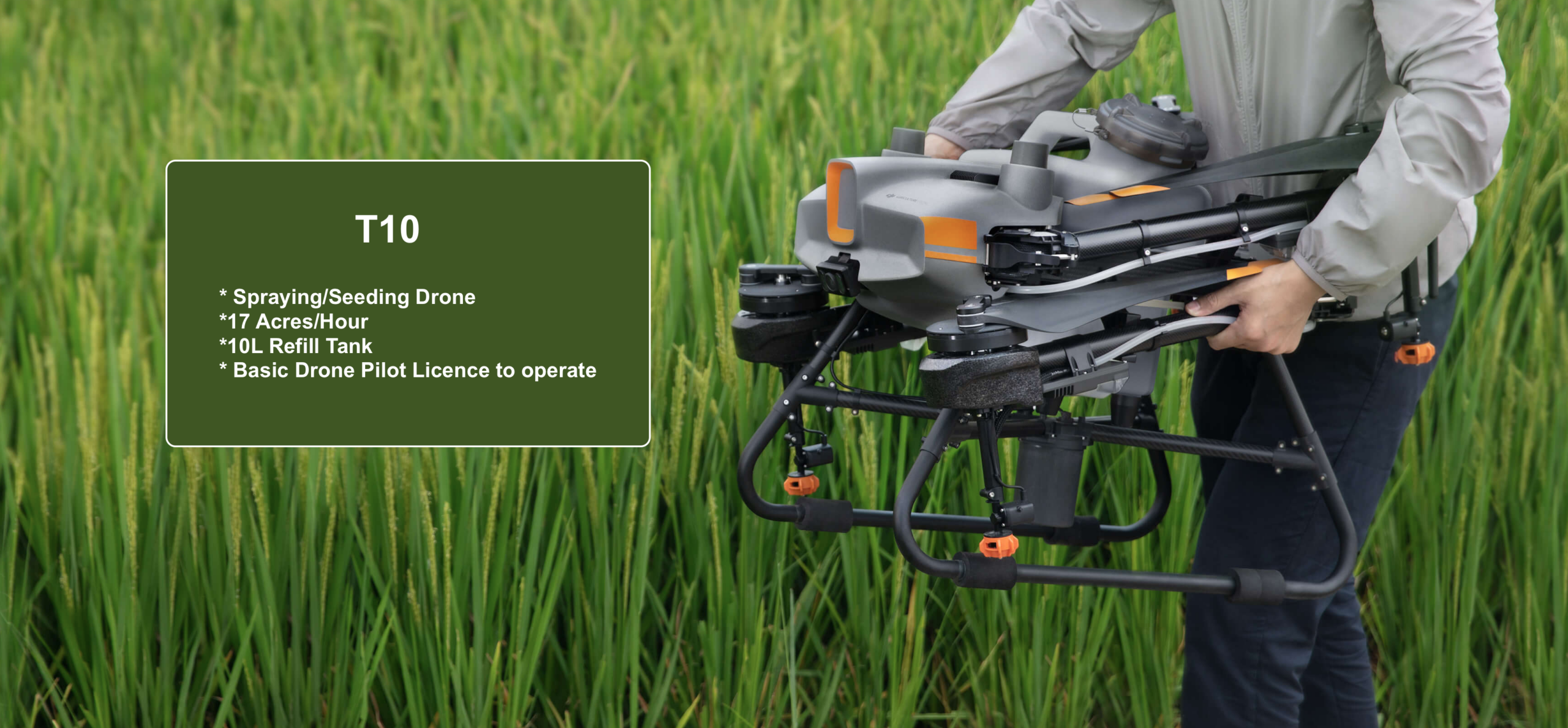 Equipped with a 10 L operating box, the spray width of the T10 can reach 5 m, and the field operation efficiency is 17 acres/hour.